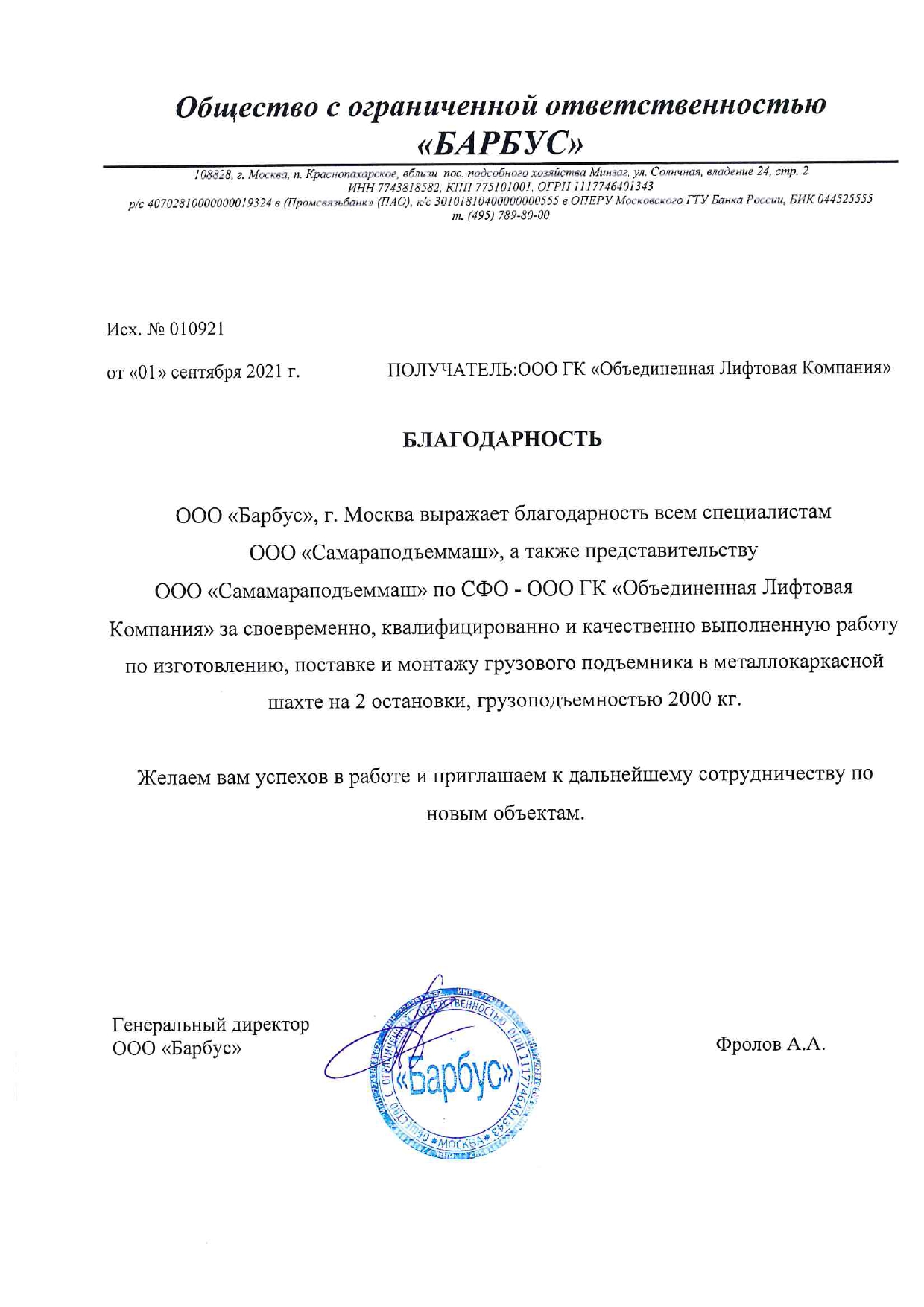 ООО "ЭкспрессЛифтСервис", г. Новосибирск выражает благодарность ООО "СПМ", г. Самара, а также Представительству ООО "СПМ" по Сибирскому Федеральному Округу - Объединенной Лифтовой Компании за изготовление и поставку грузового консольного подъемника с цепным приводом, грузоподъемностью 500 кг на 2 остановки на объект в г. Новосибирск, по адресу ул. Зеленая Горка.