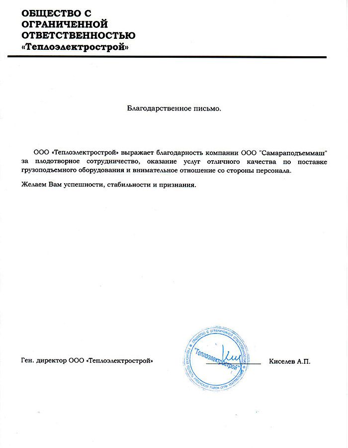 ООО «Теплоэлектрострой» выражает благодарность компании ООО «СПМ» за плодотворное сотрудничество, оказание услуг отличного качества по поставке грузоподъемного оборудования и внимательное отношение со стороны персонала.